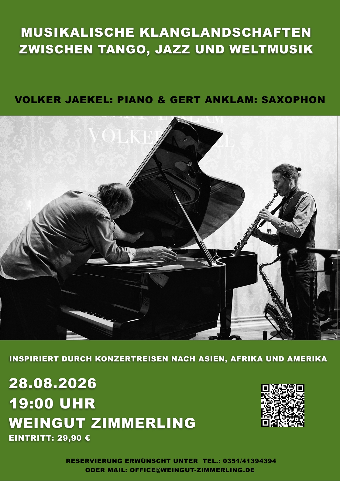 MUSIKALISCHE KLANGLANDSCHAFTEN ZWISCHEN TANGO, JAZZ UND WELTMUSIK VOLKER JAEKEL: PIANO & GERT ANKLAM: SAXOPHON + Zu Google Kalender hinzufügen + iCal / Outlook export Datum 28. Aug. 2026 Uhrzeit 19:00 - 21:00 Kosten 29,90€ Kategorie Veranstaltungen im Weingut Teile diese Veranstaltung
